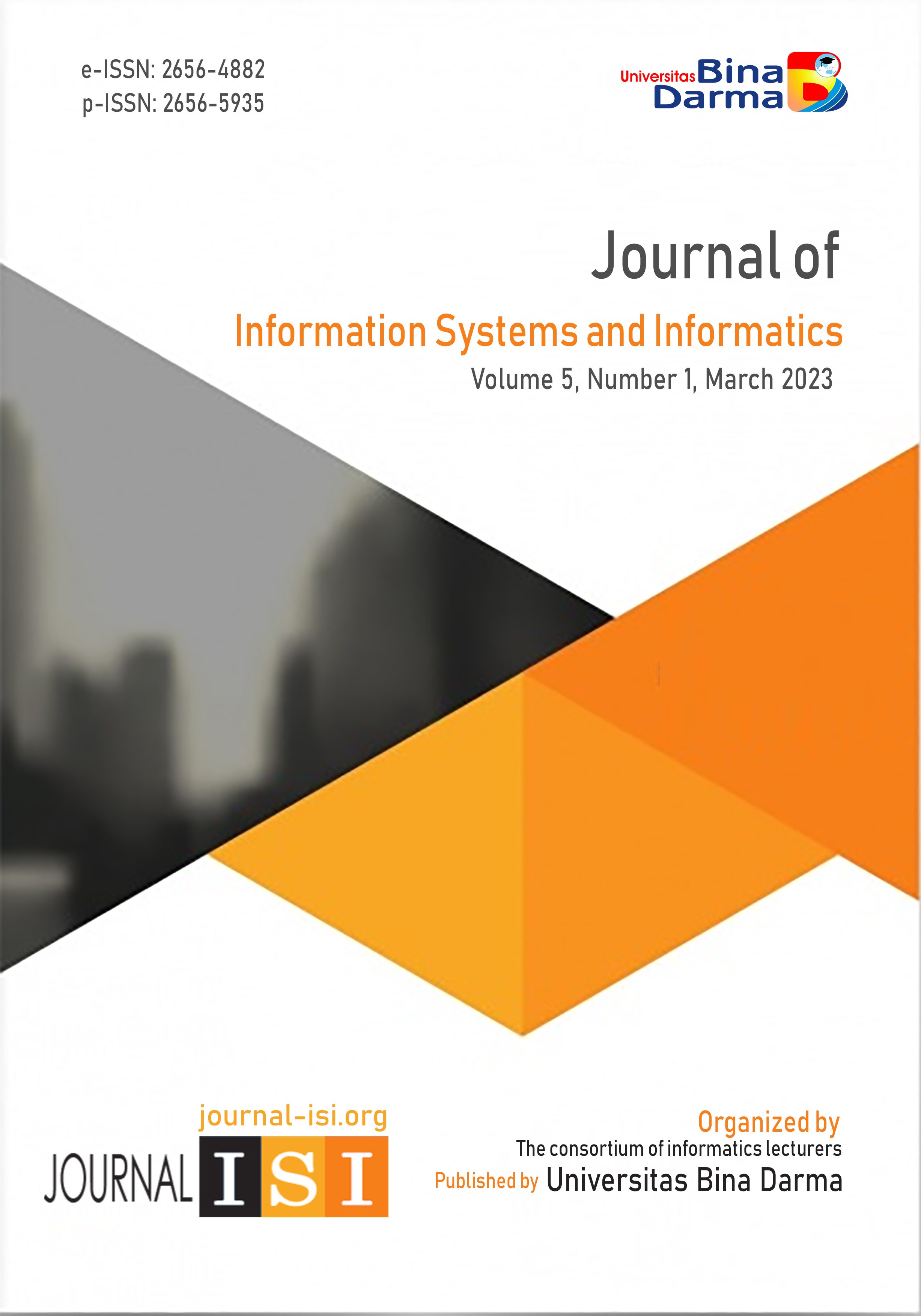 Vol 3 No 1 (2021)Journal of Information Systems and Informatics (Journal-ISI) is organized and managed independently by the consortium of informatics lecturers. Journal-ISI is an open-access journal that is provided for researchers, lecturers, and students who will publish research results in the field of information systems and informatics. Journal -ISI Volume 3 Number 1 March 2021 Published 17 articles. There are 12 affiliations in this issue, namely Universitas Padjadjaran, Universitas Internasional Batam, Universitas Kristen Satya Wacana, UIN Raden Fatah, Universitas Mercu Buana, Namibia University of Science and Technology, International University of Management-Windhoek, Universitas Amikom Purwokerto, Institut Teknologi Telkom Purwokerto, Indonesian Navy Information and Data Processing Services, Politeknik Sekayu, and Universitas Bina Darma