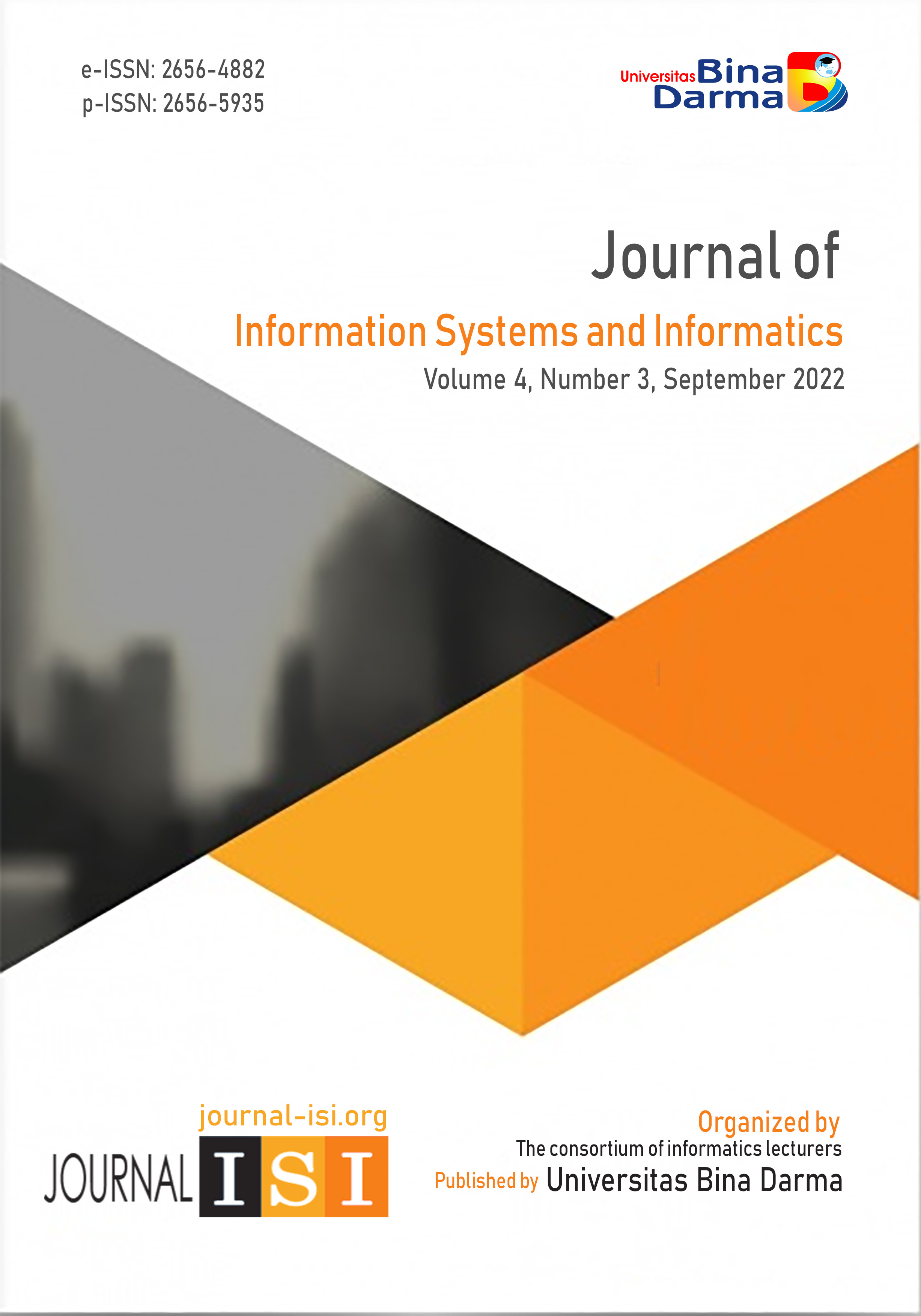 Vol 3 No 4 (2021)Journal of Information Systems and Informatics (Journal-ISI) is organized and managed independently by the consortium of informatics lecturers. Journal-ISI is an open-access journal that is provided for researchers, lecturers, and students who will publish research results in the field of information systems and informatics. Journal -ISI Volume 3 Number 4 December 2021 Published 15 articles. There are 10 affiliations in this issue, namely Gunadarma University, Atma Jaya Catholic University of Indonesia, Universitas Semarang, Universitas Indo Global Mandiri, Bina Darma University, Universitas Bandar Lampung, Satya Wacana Christian University, Institut Teknologi dan Bisnis Lembah Dempo, PasundanUniversity, STMIK Insan Pembangunan, and Amikom University